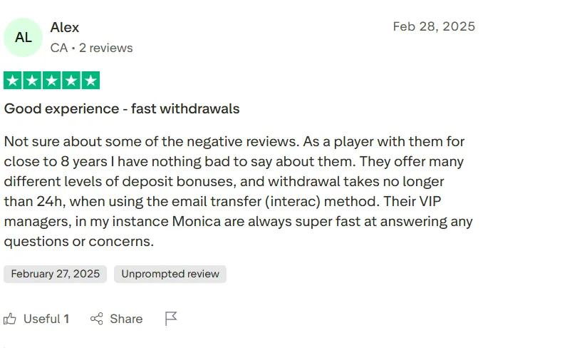 Not sure about some of the negative reviews. As a player with them for close to 8 years I have nothing bad to say about them. They offer many different levels of deposit bonuses, and withdrawal takes no longer than 24h, when using the email transfer (interac) method. Their VIP managers, in my instance Monica are always super fast at answering any questions or concerns.
